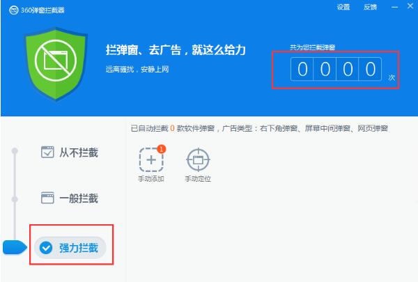 2、在“360弹窗拦截器”里点击“强力拦截”。“强力拦截”模式拦截效果更好。