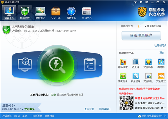 2018杀毒网为您推荐的瑞星杀毒软件是瑞星官网推出的一款永久免费杀毒软件,其采用国际最先进的六项核心技术,不但提高了病毒查杀率,还让扫描结果更加精准。瑞星杀毒软件免费下载正式版基于“智能云安全”系统设计,保证较高病毒查杀率,可将所有互联网威胁拦截在用户电脑以外,已成为国内外最具实用价值和安全保障的杀毒软件产品。